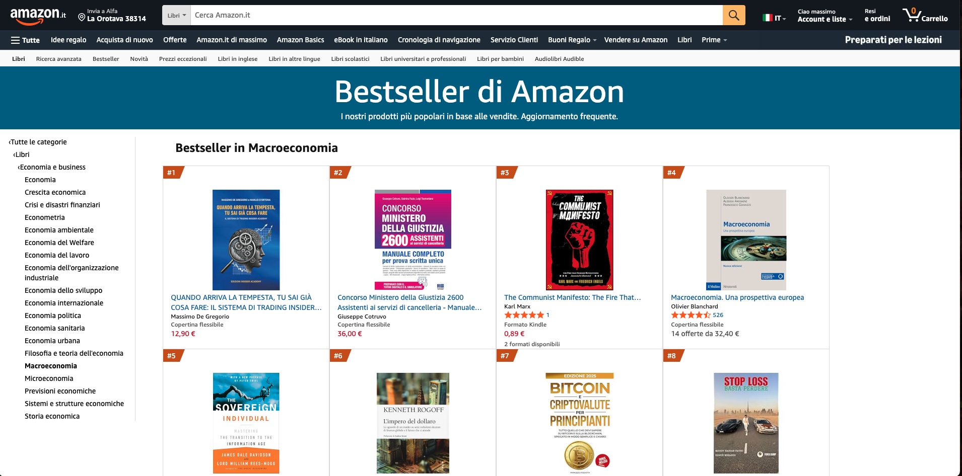 Siamo fieri di annunciare che il nostro manuale è diventato un Best-Seller su Amazon, raggiungendo la prima posizione in ben due categorie (Macroeconomia e Crescita Economica) e la seconda posizione in Previsioni Economiche. Questo risultato non è solo un traguardo per noi, ma la dimostrazione che tantissime persone cercano un approccio serio e strutturato al trading, lontano dalle promesse vuote e dagli indicatori magici.
